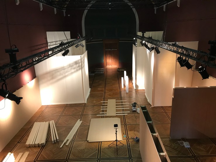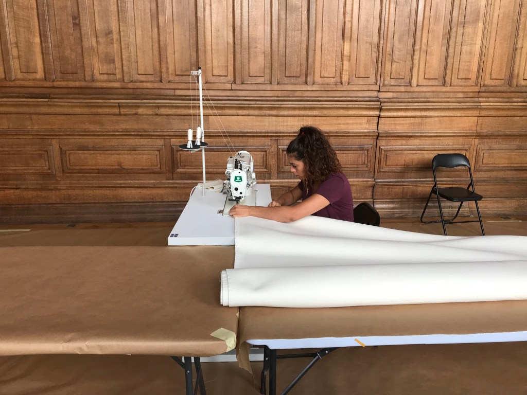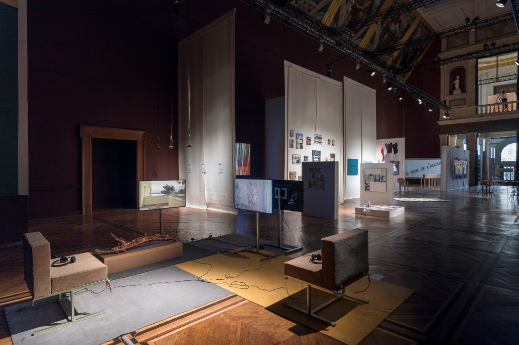 Dans le choix de ces œuvres il n’y a pas de lien en thème ou contenu et il était important de créer des cimaises au plus neutre qui vont avec l’ensemble des présentations. Pour créer une isolation acoustique des installations sonores l’idée du textile est venue. Nous avons utilisé 550m2 de feutre (matériau renouvelable et