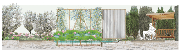 Et il en est ainsi de notre proposition pour le concours de Chaumont-sur-Loire : un paradis toujours ambivalent. En pénétrant l’enclos abrité par les haies, le visiteur pourra percevoir une reconstruction « artificielle » du paradis, coupée en deux parties égales par une cloison en PVC ondulé.