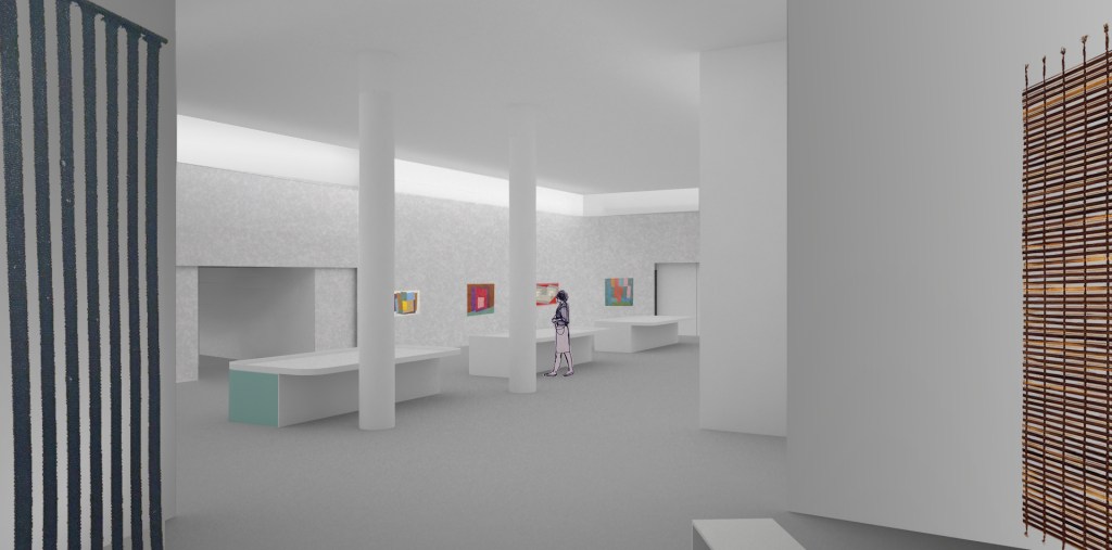 Ayant déjà travaillé avec des tapisseries d’Anni Albers au Musée d’Art Moderne en 2014 et connaissant bien le musée “Quadrat” à Bottrop autour de l’œuvre de Josef Albers, nous avons conclus que leurs réalisations peuvent être mises en lecture parallèle en ajoutant des moyens scénographiques très subtils. 2e phase de concours.